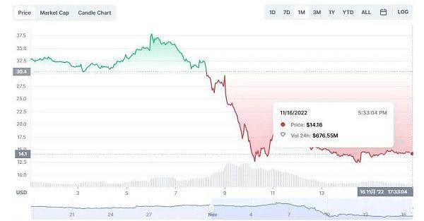 據DefiLlama數據顯示,目前Solana總鎖倉量已在近一周迅速縮水至3.2億美元,較此前最高點下跌超90%,落后于BNBChain、Polygon、Avalanche等網絡,在所有網絡中排名第十二。即便沒有FTX事件的影響,其鎖倉量的跌幅也明顯大于本輪熊市中其它一線公鏈的跌幅。而Sol的價格已經跌至14美元。