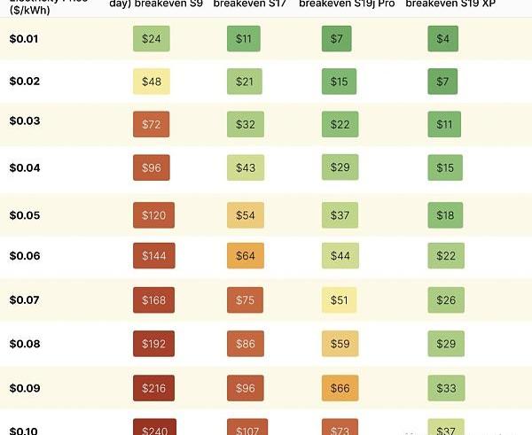 目前的算力價格是70美元/PH/s。擁有S19XP的礦工即使在電價為0.1美元/度的情況下,也能賺取體面的利潤。而S19jPro則只有在電價低于0.07美元/度的情況下才能獲得體面的毛利率。中等效率的機型S17若想其挖礦利潤達到23%,則其電價需要低于0.05美元/度。?