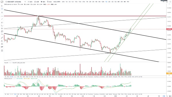 前期提示,強壓位于18年與19年兩個頂點連線的趨勢線5美元附近,直接一次性突破的可能性不大,今日最高觸及4.999美元開始回落,價格仍位于5日線上方,多層均線多頭排列,指標上也都保持上行姿態,趨勢上依然看好,關鍵阻力位的突破從來不是一蹴而就,適當的回落調整是蓄勢的表現,預計近期仍處于趨勢線下方盤整消化,消磨上方阻力后繼續上行突破的概率大。支撐4.5美元,壓力5美元。