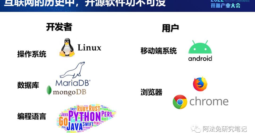 首先,從開發者的角度來看,今天耳熟能詳的很多應用和基礎設施,都是基于開源做出來的。比如說,操作系統Linux,Linux應用非常廣泛,例如車載操作系統,嵌入式、服務器等等,還有就是數據庫,像MariaDB和MongoDB。包括我們耳熟能詳的編程語言,比如Python、JAVA、RUST、Go等等,這些開源語言編寫出來的應用占據了互聯網應用的很大一部分江山。