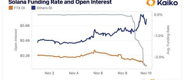 接著說Alameda,該公司持有大量的SOL和Solana生態系統代幣。FTX也曾是該項目早期的支持者,SBF也經常對該網絡給予高度評價。SOL的價格在崩盤中暴跌,FTX上的未平倉合約趨向于0。其他交易所的未平倉合約激增,再加上融資率猛烈下行,表明有大量做空。