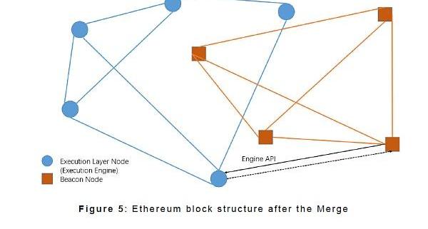 合并后,網絡結構、區塊結構、共識機制和狀態都將出現變化。新的區塊將攜帶Beacon區塊的外部以及來自以太坊的工作量證明的內容。網絡將采用共識層和執行層形式的架構來產生和同步區塊。新系統將采用權益證明共識機制,由驗證委員會執行提議和投票的功能,以形成對某些區塊的共識。共識層和執行層將被連接起來,同時無狀態性也將被引入,這不僅有助于保持去中心化的程度,也有助于未來的分片。