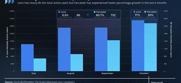 到目前為止,10月份Lens擁有20,000名活躍用戶,這是該協議的歷史最高水平,是Farcaster的近8倍;