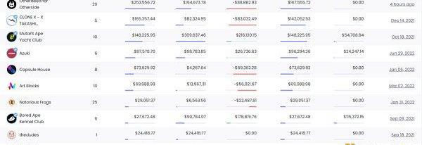 接著,在該圖數據中可以看出,該地址的買入時價值最高的幾個項目都是一些知名的藍籌,除了剛剛講過的MAYC外,其還參與了Otherdeed、CLONEX、Azuki等項目,其中Otherdeed和CLONEX到目前為止還處于虧損狀態,高達$80k。