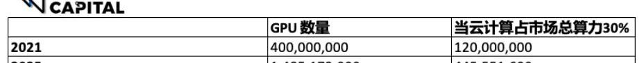 2021年全球GPU總出貨量加保有量大約是4億顆,預計到2025年年底GPU總出貨量加保有量大約是~15億顆。假設云廠商擁有全市場30%的算力,按照同比例,云廠于2021年擁有1.2億顆GPU,于2025年擁有4.5億顆GPU。