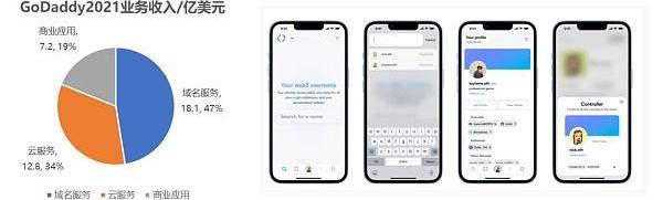 域名業務作為流量入口,為ENS生態發展帶來想象力。DNS的域名注冊商往往依靠域名這個流量入口發展其他業務,如Cloudfare為建站提供安全服務,而只以批發價出售域名。Godaddy在為用戶提供域名全流程服務的同時,也提供了企業信息化運營的一整套工具,當用戶購買完域名后可以快捷地選擇網站部署、郵箱搭建等便利的增值服務。作為知名DNS域名服務商,目前GoDaddy的域名服務收入只占總收入的47%。ENS也是如此,目前ENS除了域名出售的核心功能外,也在做移動端的開發。一套手機端的域名管理、查詢應用,可能距離Web3的社交通訊錄并沒有那么遙遠。