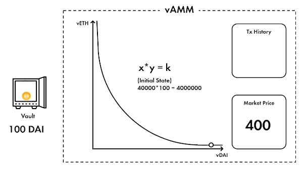 (2)Perpetual 協議將來自Bob的 -1,000 vDAI記入vAMM,vAMM根據一個恒定乘積函數(x*y=k)計算Bob收到的負vETH的數量。