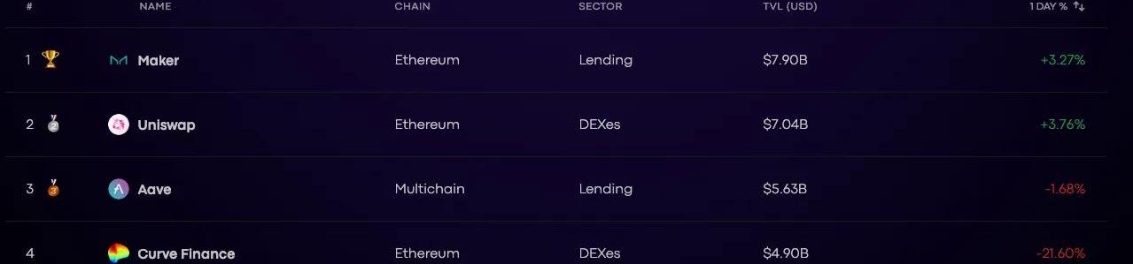 盡管使用TVL作為衡量標準有許多缺陷,但Maker在DeFi協議的榜首位置是有說服力的。在2020年后出現爆炸性增長的生態系統中,Maker的崛起是最迅速的。