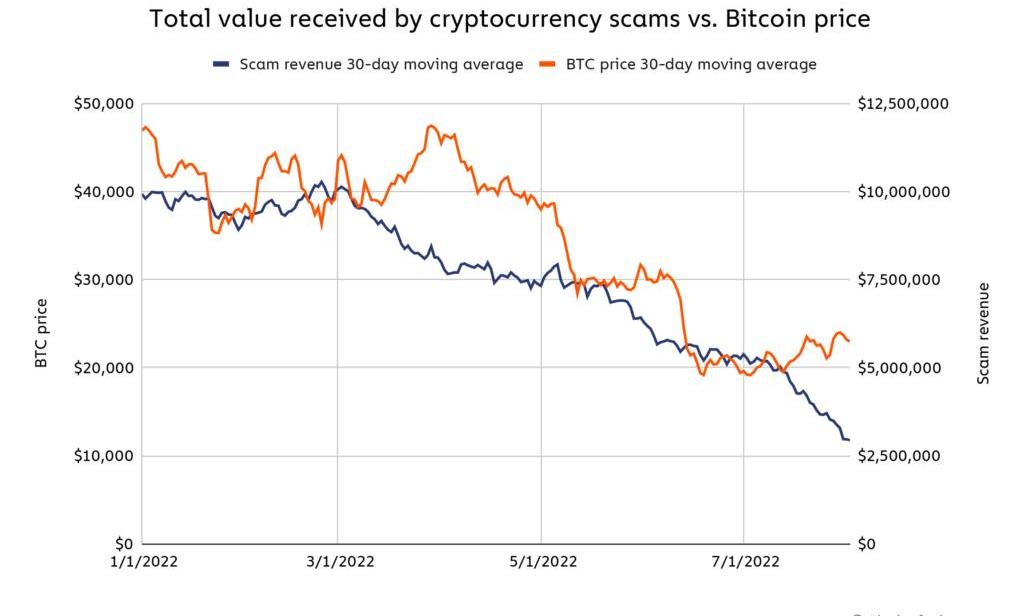 2022年的詐騙總收入目前為16億美元,對比2021年7月底降低65%,這種下降似乎與加密貨幣的價格下跌有關。