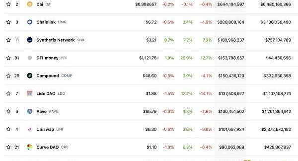 DeFi項目鎖定資產前十排名及鎖倉量數據來源:defillama