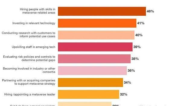 公司也在推進相關的組織變革,32%的公司計劃雇傭或任命一名“元宇宙領導者”,51%的公司已經指定了專注于元宇宙活動的職位(即使不總是專門的),類似的數字職位也集中在加密貨幣或NFT上,這些職位的崛起是令人鼓舞的,但真正的元宇宙價值需要的不僅僅是把責任分配給一個有技術,有遠見的人,你需要將技能、技術和內部流程結合起來,完善整個結構,以實現元宇宙業務成果。