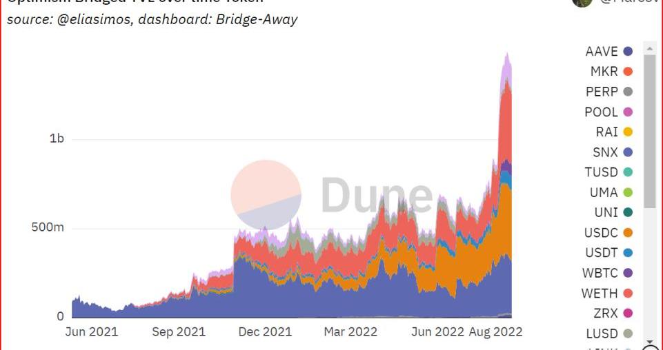 而6月1日OP代幣剛發行時,跨鏈橋TVL僅6.67億美元,它在兩個半月的時間整體上漲了113.94%。