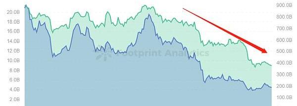 隨著Crypto市場的崩盤,導致投資者對NFT的需求也出現了相應幅度衰退,極大地影響其整體交易量和售價下跌。從圖表中可以看出,5月中旬之后,BoredApeYachtClub和Cryptopunks的交易量和FloorPrice都在下滑。