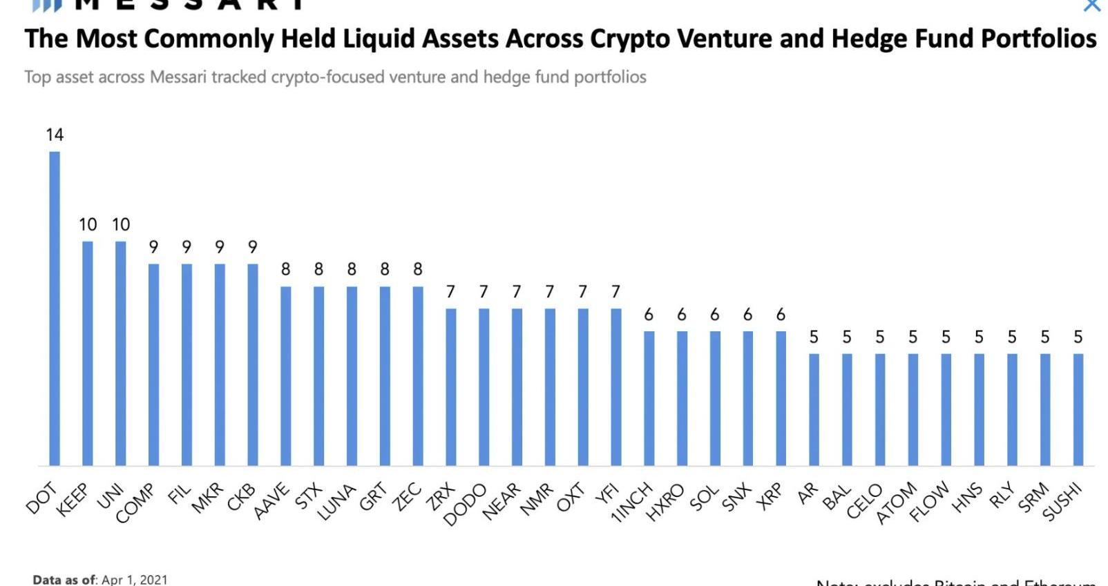 Polkadot似乎也受到了加密基金的青睞,14家頂級基金的投資組合中持有DOT,而只有5家頂級基金的投資組合中持有ATOM。數據來自Messari去年4月發表的一項研究報告。
