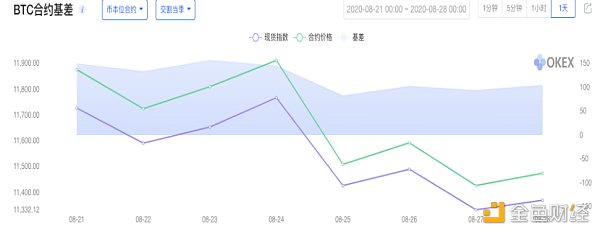 截圖來自OKEx交易大數據,圖中可以看出,本周BTC合約價格一路下行,而合約基差周一小幅下跌后,周二至周五呈現出小幅抬升的趨勢,不過仍為正基差,此種背離形態側面反映出當下的合約價格的下跌風險在減弱,短期有望止跌反彈,投資者注意做空的風險。