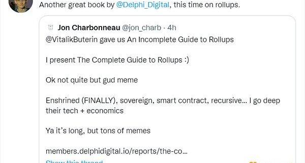 XRP/HKD+0.46%注:8月5日,加密研究員JonCharbonneau在DelphiDigital上發布了《Rollup完全指南》,從其熟知的以太坊和Celestia的兩個項目出發,詳實闡述了Rollup的技術和經濟。對此,V神給予了贊賞,稱這是一本關于Rollup的“好書”。
