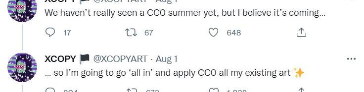 8月1日,知名加密藝術家XCOPY發布推文,宣布他的全部作品將轉為CC0許可;