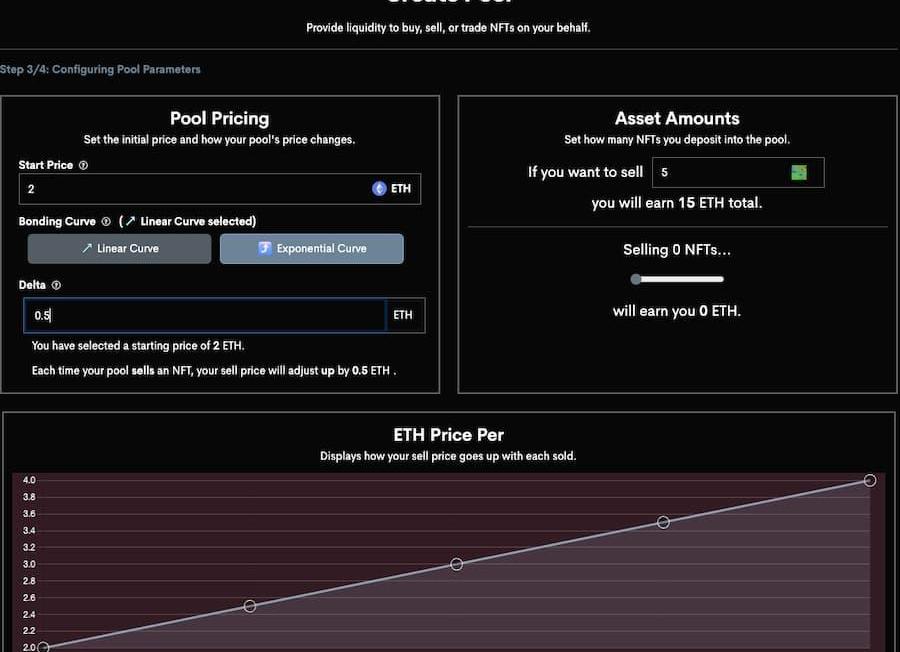 比如,創建出售5個NFT的池子時,設置起始價格為2ETH,若選擇線性曲線且Delta值設為0.5,那么,第一個NFT的價格為2ETH,第二個為2.5ETH,第三個為3ETH,以此類推;若選擇指數曲線且Delta值設置為50%,則第二個NFT的價格為3ETH,第三個為4.5ETH。