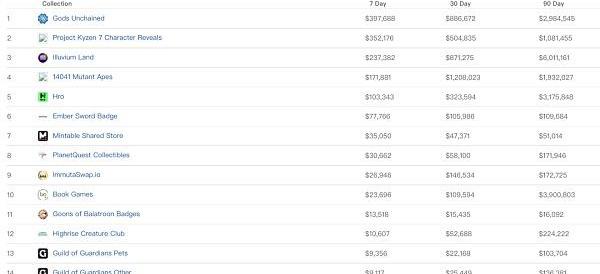 下圖展示了IMX按近7日交易量排名前15的項目,其中#1GodsUnchained、#3Illuvium、#6EmberSword、#8PlanetQuest、#13#14GOG均是IMX官方推介的游戲項目。