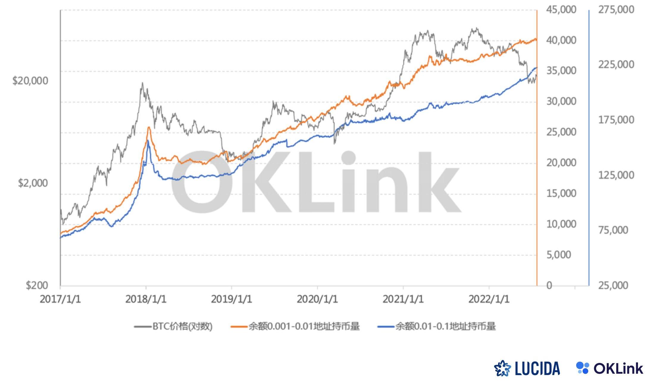 0.001-0.01BTC地址持幣量vs0.01-0.1BTC地址持幣量vsBTC價格