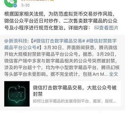 今年3月份以來,微信封禁了十余家數字藏品平臺,官方表示,“根據國家相關法規,為防范虛擬貨幣交易炒作風險,微信公眾平臺近日對炒作、二次售賣數字藏品的公眾號及小程序進行規范化整治。”對于僅提供數字藏品展示和一級交易的公眾號,微信方也要求提供和國家網信辦已備案認可的區塊鏈公司的合作證明作為資質證明。