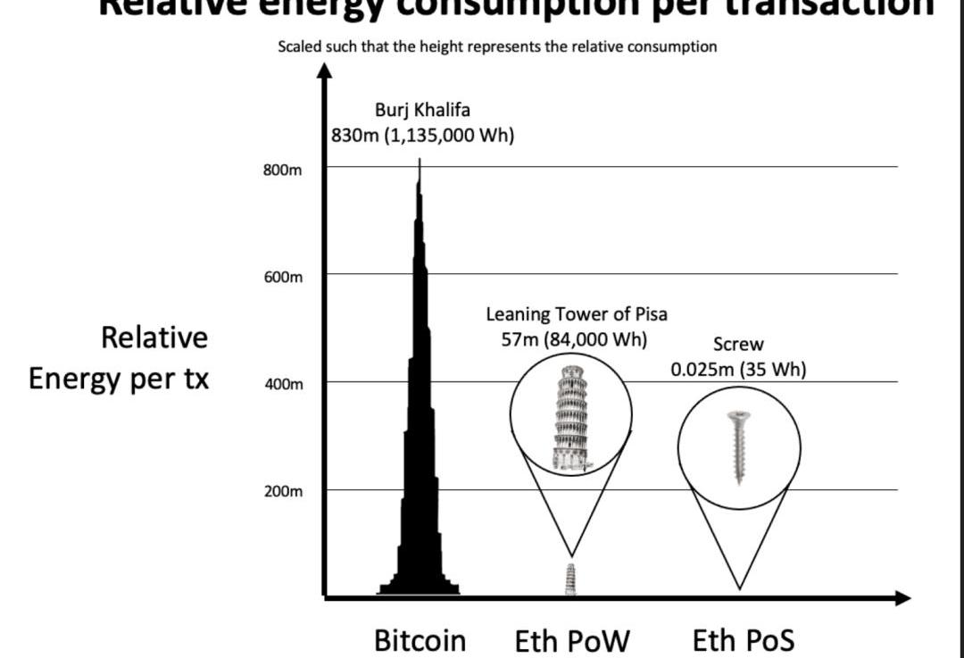據了解,合并之后,以太坊網絡的耗電量將減少99%以上。10萬次Visa交易大概消耗149度電,相比之下,合并后的PoS以太坊網絡進行10萬次交易只消耗0.667度電。