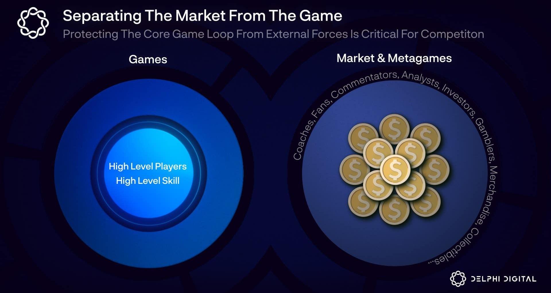 在視頻游戲方面,在承認游戲的核心魔法圈必須保持不變的情況下,人們可能會想,我們如何適應那些對個人登上某款游戲的頂層不感興趣的更大用戶。畢竟,現代游戲中有無數的用戶原型,有渴望消費的鯨魚,有想在頂級玩家身上下注的投機者,還有以其他方式享受游戲的更多休閑愛好者。正如我們在第一節末尾所探討的那樣,如果不加馴服,金錢將永遠趨向于主導動機。因此,第一個端口是將市場游戲從核心游戲圈本身分離出來。這樣一來,我們就可以開始定義獨立的魔法圈,它們相互協調但不相互干擾。沒有人會被騙去玩對方的游戲。