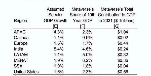 如果元宇宙在2022年開始采用,那么元宇宙在2031年對全球GDP的總貢獻將為至少3.01萬億美元。