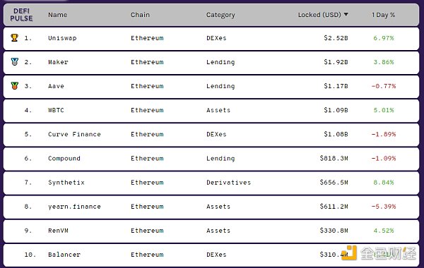 DeFi排名前十鎖倉量 數據來源:DeFi Pluse