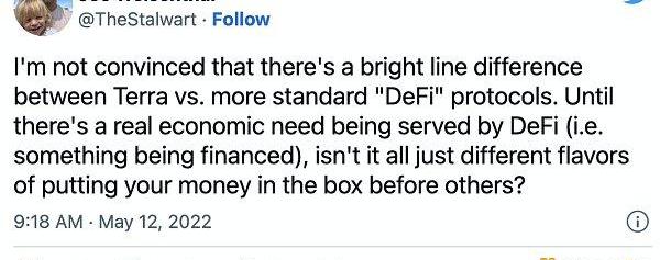 “我不認為Terra與更標準的DeFi協議之間存在明顯差異。直到DeFi滿足真正的經濟需求,這不就是把你的錢放在其他人之前的不同風格嗎?”