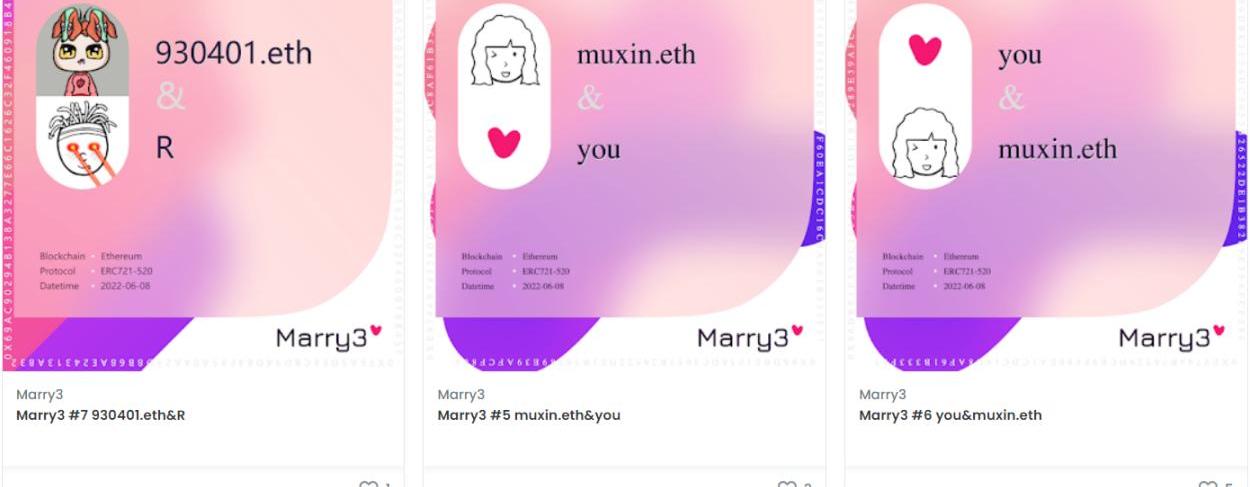 據PANews了解,截至6月29日,Marry3上已經“結婚”的couples有48對,目前mint的手續費為0.01ETH,隨著參與用戶的增加,mint的價格也會隨之上漲,最高為0.05ETH。目前Marry3僅上線“結婚”功能,未來將逐漸上線“離婚”、紀念日證明、與其它社交應用合作等更多功能。