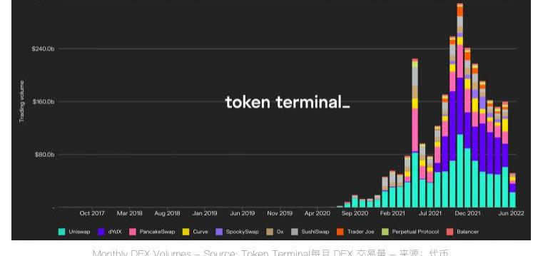 月度DEX交易量遠低于2021年11月21日的峰值$308.6B。2022年6月的交易量目前有望達到$103.3B。這將代表10個平臺樣本集的66.2%下降。由于交易活動和價格升值高度相關,這種下降趨勢可能歸因于過去幾個月的市場疲軟。