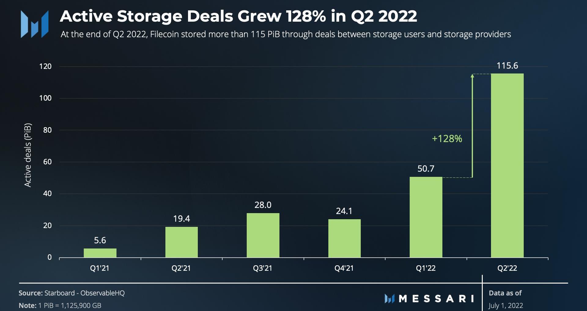 到2022年第二季度末,Filecoin通過活躍交易存儲了超過115PiB,相對于上一季度增長了128%。這可能是由于向用戶收取的存儲數據費用幾乎為零的緣故。
