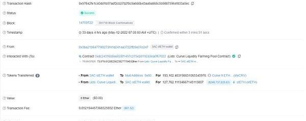 同時,三箭資本還在拋售stETH。在stETH“脫鉤”至0.94ETH時,三箭資本從Curve中抽出了12.7萬枚stETH的流動性。