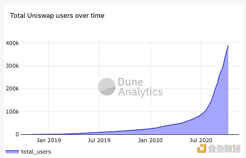 另一方面,Uniswap是去中心化金融行業指數級增長的主要推動力,尤其是在最近三個月中,Uniswap經歷了快速增長。如下圖所示,Uniswap獨立用戶量已經接近39萬,而三個月前這一數字僅為70,900,六個月前僅為45,780,目前整個去中心化金融行業內大約有80%的用戶曾在某個時候使用過Uniswap。