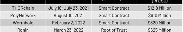 破壞跨鏈橋安全性的兩個主要攻擊載體是1)?智能合約漏洞和2)?信任根漏洞。