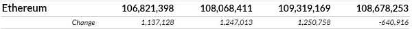 自2015年以來,ETH的自由流通供應量首次下降,減少數量為64.09萬枚,這與此前連續五個季度平均120萬ETH的自由流通供應量增長形成鮮明對比。原因是ETH在本季度已滿5年,約有190萬枚ETH被歸類為長期戰略投資持有或已經丟失。隨著哈希率的增加,本季度新挖出的ETH為125萬枚,比上季度增長4%。本季度從基金會和團隊地址轉出的ETH總數為2.3萬枚。