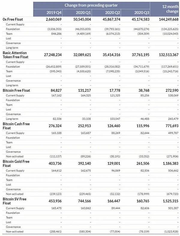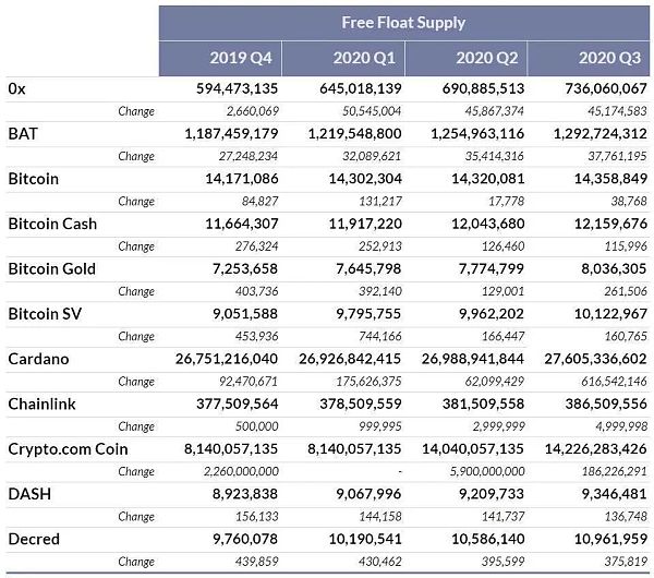 XRP/HKD-2.89%CoinMetrics根據CMBI浮動調整方法,發布了2020年第三季度“供應透明度報告”。該報告揭示了加密資產持有者的關鍵行為類別,報告分析了以下加密貨幣資產的自由流通量(可理解為潛在的市場拋壓):BTC、ETH、BCH、BSV、ADA、LINK、CRO、DASH、ZRX、BAT、HT、LTC、MKR、NEO、XTZ、XRP、ZEC等。