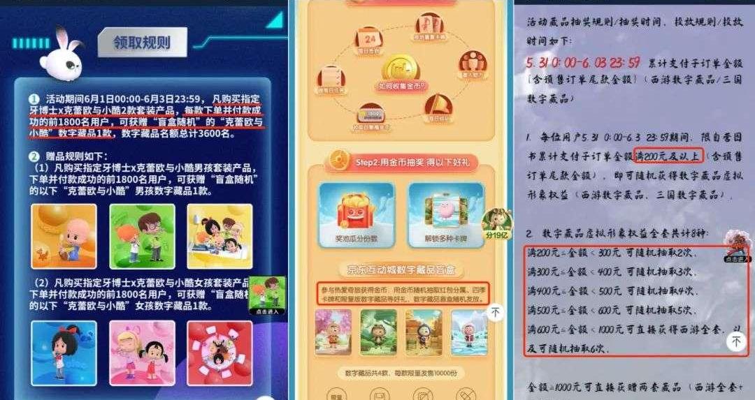 除了和單獨的品牌、IP等聯合推出數字藏品,數字藏品這一形式和平臺活動也結合得較為頻繁,如“618京東超級互動城數字藏品”,通過做任務,得金幣,然后抽取數字藏品;京東圖書發行的《漫畫三國》系列數字藏品,獲得的最低門檻為固定時間內自營圖書累計支付子訂單金額滿200元及以上,而未限定在某一品牌產品。從整體的發行頻率來看,似乎也隨平臺的銷售活動、計劃變動,如6月有兒童節,還有618購物節,發布的藏品數量也相對較多。