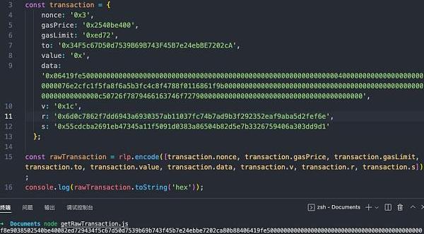 再對交易內容進行RLP編碼后得到原始交易內容: