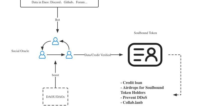 通過社交預言機機制,DAOU激勵同一DAO組織中的成員為其他成員生產的數據進行簽名和驗證,并根據這些數據給每個成員一個可靠的打分,這個分數就是DAO成員的信用評級。社交預言機驗證的數據將通過DAO以靈魂綁定Token的形式發布,并可以對外使用,例如鏈上信用貸款、空投目標篩選等。