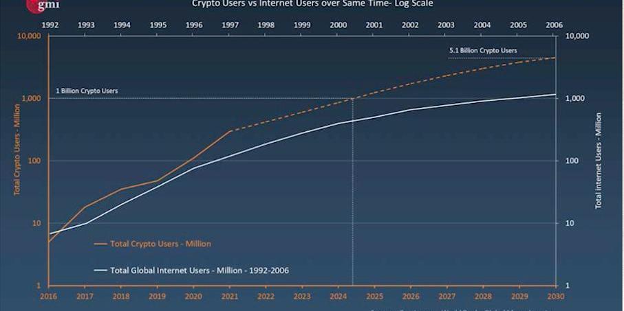 下一張圖以更直觀的形式比較了Crypto和互聯網用戶的增長預測情況。我們假設從第六年開始,互聯網每年以43%的速度增長,那么在第十年它將達到500萬用戶。如果Crypto也以同樣的速度增長,那么第十年的用戶數量將達到1.2億。但如果Crypto保持目前的增長速度,也就76%的話,第十年用戶總數將達到28億。無論如何,該增長都將是爆炸性的。