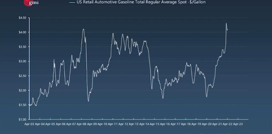 如果工資不提高,公司售價不提升的話,那么成本的提升將引發需求破壞,而提高的部分將作為對消費者和企業的一種稅收。下圖是美國的汽油價格,近期增長驚人。不僅如此,食品等一系列商品的價格都提高了。這就意味著人們將不得不在基本的商品和服務上花費更多的價錢,而其他方面的支出將相應的減少,有一些餐館都因此而倒閉了。
