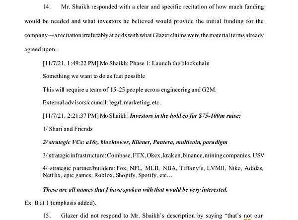 根據WhatsApp的文字記錄顯示,Shaikh告訴ShariGlazer,該公司需要「7500萬至1億美元」才能啟動,同時他還列舉了與他談論該項目的VC,包括A16Z、Coinbase、Multicoin、Paradigm、Pantera等。