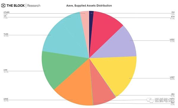 Compound的供應資產以穩定幣和ETH為主,而Aave分布更為均勻,USDC、USDT、TUSD、ETH、LINK、LEND的比例都相差不遠。或多或少反映了兩者業務上的差異。