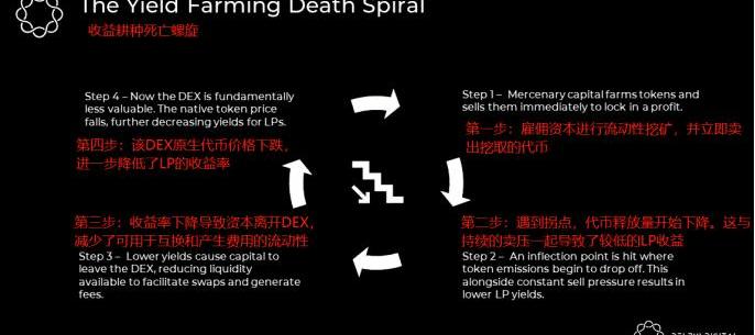 最后,反射性下行周期開始生效,因為流動性退出DEX使其從根本上一文不值。較低的流動性意味著DEX無法支持如此多的交易量,這將導致成本降低。這導致了基本面的進一步貶值和原生代幣價格的下跌,進一步降低了LP的收益率。
