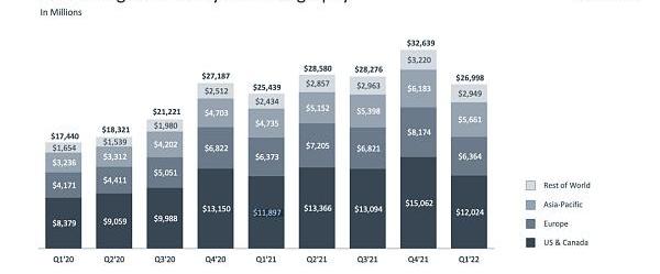 導致廣告收入不及預期的原因包括俄烏戰爭影響歐洲企業的廣告投放。22年Q1,歐洲是META所在各個地區中唯一一個廣告營收下降的市場,該季度營收為63.64億元,略低于上年同期的63.73億元。