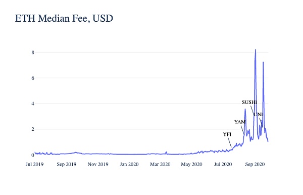 隨著 SUSHI 上線,以太坊的交易費中位數于 9 月 2 日創下歷史新高,即,8.25 美元。