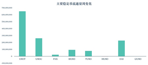 過去一周,USDT的流通量增加了6.5億。有10億USDT從Tron遷移至以太坊。除此之外,Tether還在Tron上增發了兩次,共5億USDT;在以太坊上增發了1.5億USDT。USDC的流通量增加了2.6億,DAI的流通量增加了2.3億。PAX、BUSD、TUSD、GUSD的流通量分別增加2359萬、9397萬、7786萬、135萬。HUSD的流通量減少139萬。