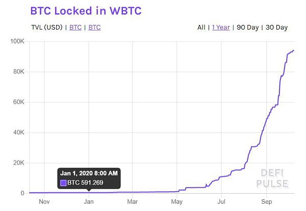 根據defipulse數據,今年1月1日,WBTC的鑄造量方才591枚,而9個月后的10月1日,WBTC流通總量已達92017枚,整整翻了155倍,與WBTC鑄造量激增相同步的是其生態的攻城略地,目前幾乎所有頭部DeFi都已實現了覆蓋。